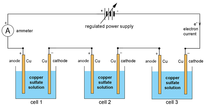 Electrorefining metals Virtually all copper produced from ore receives an electrolytic treatment by electrorefining from impure anodes. In electrorefining, the anodes consist of unrefined impure metal, and as the current passes through the acidic electrolyte the anodes are corroded into the solution so that the electroplating process deposits refined pure metal onto the cathodes. In order to achieve high production rates, high current densities are desirable but an excessive current density causes at least two problems: increased impurity levels in the cathode deposit; and anode passivity occurs at current densities above 25-28 mA/cm2. Hence, in industry, the current density is always low. An interesting experiment would be to set up an electrorefining cell for copper and find out the optimum current density and/or acid concentration.